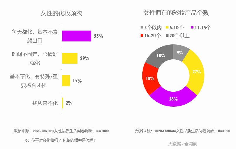 CBNData《報告》顯示,越來越多的女性開始關(guān)注對自己外在形象的話語權(quán),近年來彩妝消費需求強勁。55%的女性每天化妝,64%的女性擁有10件以上的化妝品。