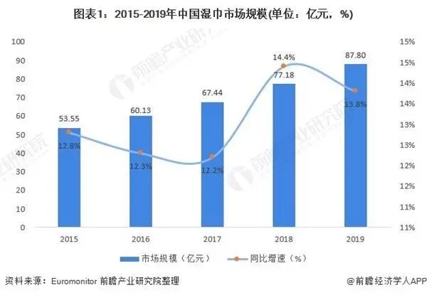 近年來,我國(guó)濕巾行業(yè)發(fā)展積極向好,市場(chǎng)規(guī)模增速遠(yuǎn)高于全球濕巾行業(yè)市場(chǎng)規(guī)模,2019年我國(guó)濕巾行業(yè)市場(chǎng)規(guī)模達(dá)到了87.8億元,2015-2019年復(fù)合增長(zhǎng)率在13.16%。