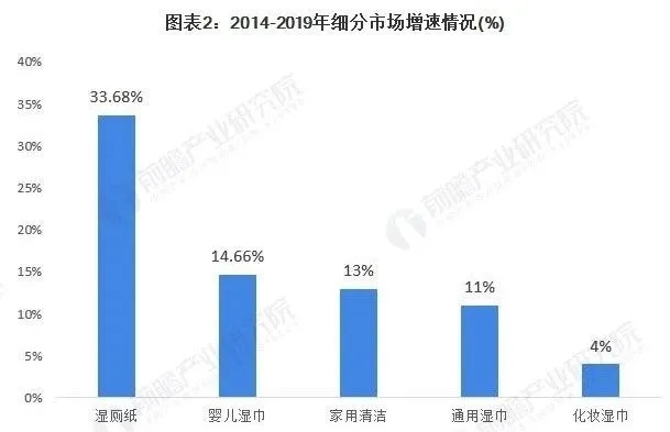 隨著我國人民個人衛(wèi)生意識的不斷提高,人們對濕巾的需求越來越大,對濕巾品類和原料的要求也越來越高。因此濕巾品類不斷豐富,出現(xiàn)更多具有較強針對性的產(chǎn)品,比如濕廁紙、嬰兒用紙、廚房濕巾、卸妝濕巾等。目前我國市場中嬰兒濕巾仍占據(jù)主要市場份額,但濕廁紙增速迅猛,高達33.68%,有望趕超嬰兒濕巾。