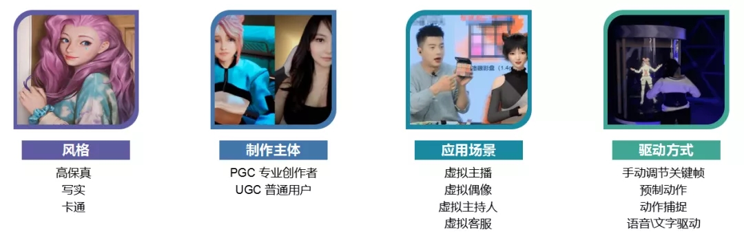對于虛擬人的技術(shù)分類,我們可以從風(fēng)格、創(chuàng)作主體、應(yīng)用場景、驅(qū)動方式幾個方面進(jìn)行了解: