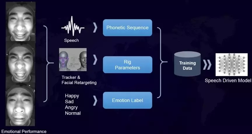 為此,團(tuán)隊建立了一套精確的面部動捕流程,以不同情感下的動作捕捉,來訓(xùn)練語音驅(qū)動模型,最終構(gòu)造了一個長約20個小時、13339條語句的,包含語音、面部運(yùn)動和身體運(yùn)動的多模態(tài)訓(xùn)練數(shù)據(jù)集。在Siren AI 基礎(chǔ)上,增加情感維度數(shù)據(jù),讓Matt擁有微笑、蹙眉等微表情,多了更自然的“人情味”。