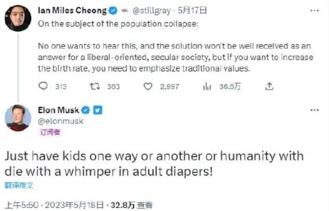 據(jù)財(cái)聯(lián)社報(bào)道,馬斯克近兩年頻繁就全球人口減少的問(wèn)題多次發(fā)出警告,日前他又再度“催生”。馬斯克在一則推文中強(qiáng)調(diào)在出生率下降的情況下迫切需要采取行動(dòng),以及若不作為,人類未來(lái)所面臨的潛在后果。#馬斯克再敲人口警鐘#