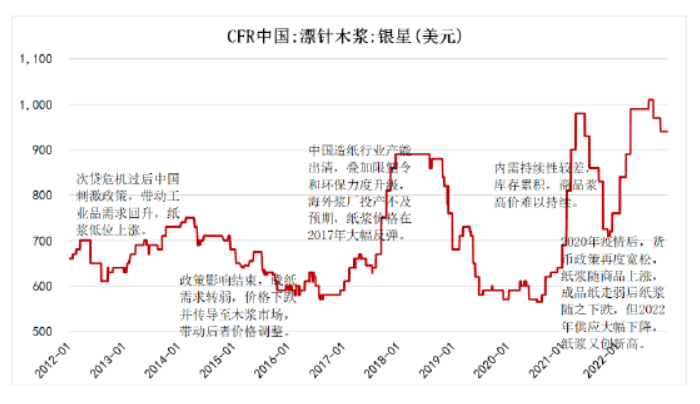 然而,針對(duì)木漿這一原材料,生活用紙企業(yè)非常被動(dòng)。據(jù)方正中期期貨數(shù)據(jù)顯示,我們可以在下表的漂針木漿(銀星)CFR現(xiàn)貨價(jià)走勢(shì)中發(fā)現(xiàn),從2012年到2022年,木漿價(jià)格整體攀升幅度非常大,同時(shí)波動(dòng)明顯。直到2022年,木漿現(xiàn)貨價(jià)格達(dá)到歷史高位。由此可見(jiàn),生活用紙企業(yè)在囤積原材料方面壓力不小。
